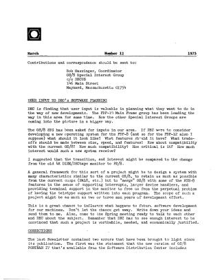 This newsletter (Number 12) from March 1975 covers various updates, requests for user input, and new software releases/projects for DEC's PDP-8 and PDP-12 systems.