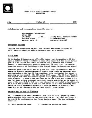 SIG News: The group officially changed its designation to "12 Bit Special Interest Group" to encompass PDP-8 and PDP-12 hardware/software beyond just OS/8. A steering committee was appointed, and the SIG is seeking representation on the US Executive Board, noting its status as the oldest and largest SIG. DEC is requesting user papers on multiprocessing and transaction processing needs for the Fall US Symposium.