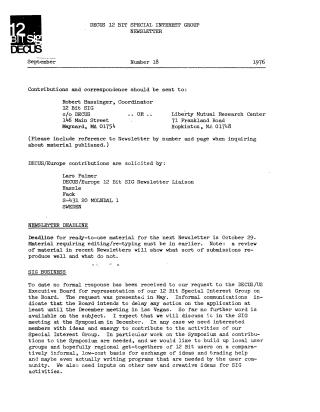 This September 1976 DECUS 12 Bit SIG Newsletter (Number 18) provides updates on various PDP-8 related software and outlines plans for upcoming events.