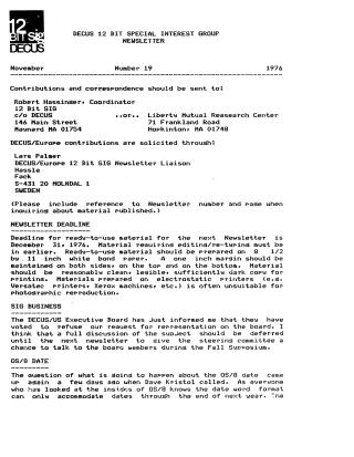 This November 1976 DECUS 12 Bit SIG Newsletter (Number 19) covers administrative updates, significant software and system challenges, user-contributed solutions, and new utility programs.