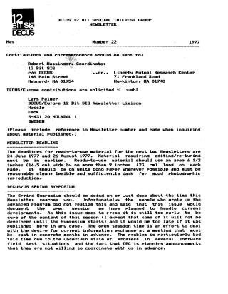 - Contact information for contributions to the 12 Bit SIG Newsletter (Robert Hassinger, Lars Palmer for DECUS/Europe).