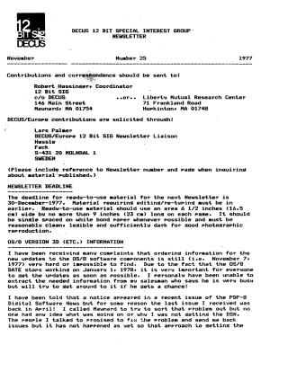 This newsletter for the DECUS 12 Bit Special Interest Group covers a wide range of topics pertinent to PDP-8 users in November 1977.
