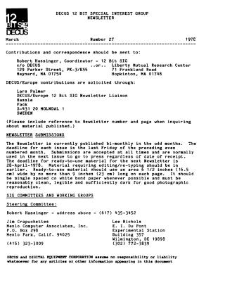 This March 1978 DECUS 12 Bit SIG Newsletter provides updates on the upcoming Spring Symposium, detailing sessions on new BASIC, MACREL, TECO, PDP-8 product discussions, and workshops on DECstation-78, OS/8, and RTS/8. It also highlights presentations on real-time systems, micro-8 applications, and interprocessor buffers.