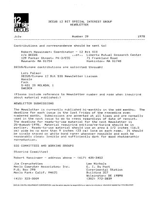 This issue of the DECUS 12 Bit SIG Newsletter, coordinated by Robert Hassinger, provides updates, technical discussions, software announcements, and requests for assistance from its members. The newsletter is published bi-monthly in odd months.