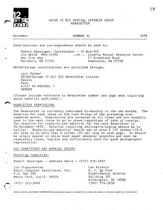 This newsletter from November 1978 provides updates and technical discussions for the DECUS 12 Bit Special Interest Group. It includes administrative information such as contact details for the coordinator and European liaison, submission guidelines for the bi-monthly newsletter, and lists members of various SIG committees and working groups.