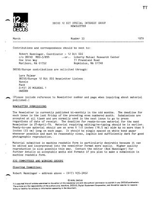 This document is issue number 33 of the DECUS 12 Bit Special Interest Group Newsletter, published in March 1979. It provides administrative information, updates on ongoing projects, new software submissions, and community discussions.
