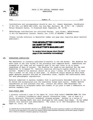 This DECUS 12 Bit SIG Newsletter (July 1979, Number 35) provides updates, user contributions, and technical notes for PDP-8 system users. Key highlights include: