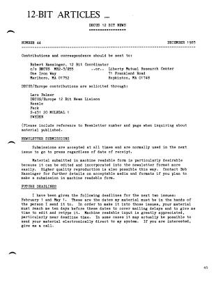This DECUS newsletter includes general information, technical updates, and community discussions for 12-Bit system users. It outlines contact points for contributions, submission guidelines (favoring machine-readable format), and upcoming deadlines for issues in February and May.