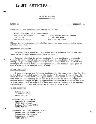 This issue of the DECUS 12-Bit News, published in February 1984, provides updates on software, community news, and technical contributions. Robert Hassinger, the 12 Bit Coordinator, outlines submission guidelines and deadlines for the newsletter, encouraging machine-readable material.