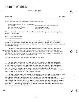 This newsletter, DECUS 12 BIT NEWS Number 48 (December 1984), provides updates and information relevant to the 12-bit computing community. It outlines guidelines for submitting material, including contact information for the 12 Bit Coordinator, Robert Hassinger. A significant portion addresses the ongoing effort to make OS/278 available on RX01 floppies for DECmate I and earlier systems, encountering difficulties with DECUS staff follow-up and the need for specific hardware assistance.