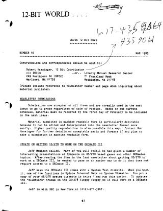 This March 1985 issue (Number 49) of the DECUS 12-Bit Newsletter reports on various software updates, user tips, and committee activities.