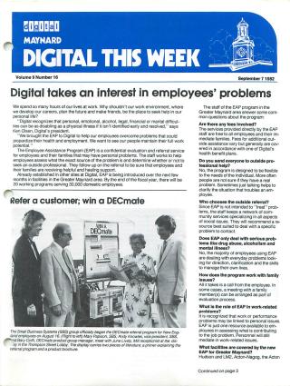 This document is a newsletter from Digital Equipment Corporation titled "Digital Takes an Interest in Employees' Problems." It discusses various programs and initiatives aimed at supporting employees.
