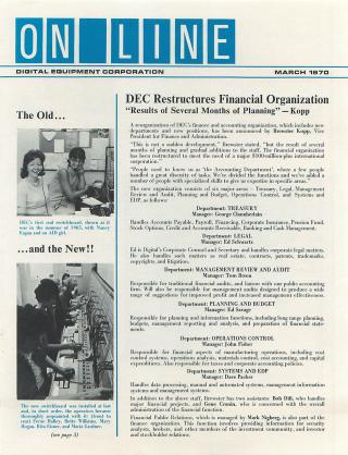 This issue of On Line, the monthly publication for Digital Equipment Corporation (DEC) employees, highlights company news and internal organizational updates from March 1970. Key features include:
