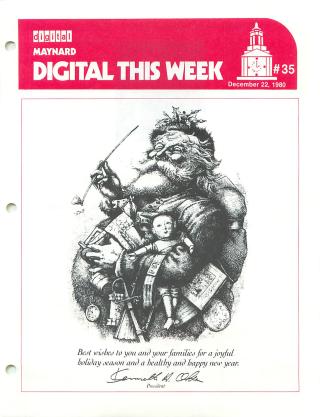 This document is the December 22, 1980, edition of "Digital This Week," an internal newsletter for Digital Equipment Corporation employees. It features a holiday greeting from the company president, updates on personnel changes in manufacturing, and announcements regarding company policies, including changes to postal rates, tax information, and blood donation drives.