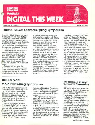 - Corporate Events: Announcements for upcoming internal symposia, including an internal DECUS Spring Symposium and a Word Processing Symposium.