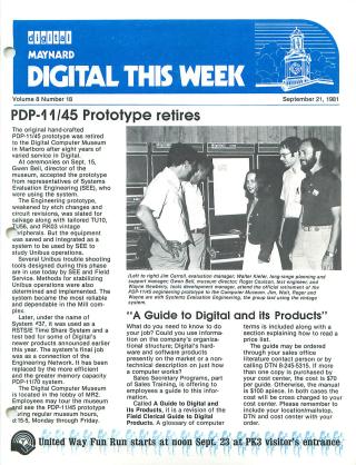 - Company News: A feature on the retirement of the original hand-crafted PDP-11/45 prototype to the Digital Computer Museum and updates on internal departments like Household Goods Relocation and the "Guide to Digital and Its Products."