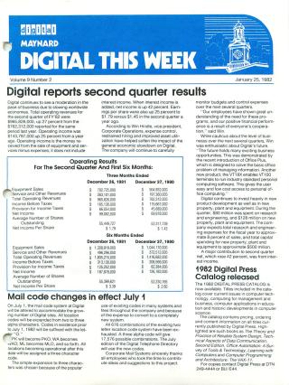 This issue of Digital This Week (January 25, 1982) serves as an internal newsletter for Digital Equipment Corporation employees. Key highlights include: