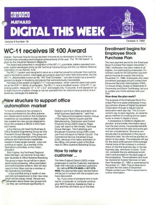 This issue of Digital This Week (October 4, 1982) serves as an internal corporate newsletter for Digital Equipment Corporation. The key updates include: