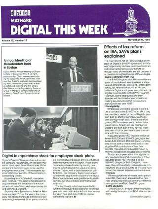 This issue of Digital This Week (dated November 24, 1986) serves as an internal corporate newsletter for Digital Equipment Corporation. Key highlights include: