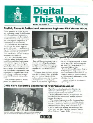 This document is the February 8, 1988, edition of "Digital This Week," an internal corporate newsletter for Digital Equipment Corporation. The issue covers various company updates, including: