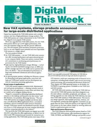 This issue of Digital This Week (February 6, 1989) highlights the announcement of new VAX 6300 systems and high-performance storage products designed for large-scale distributed applications.