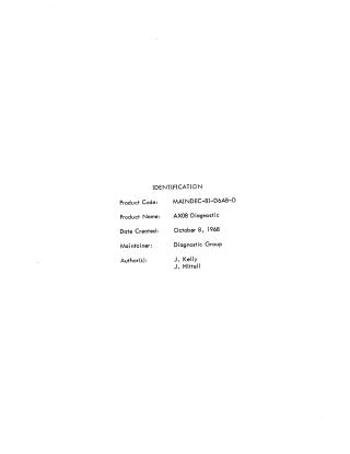 Summary: This document provides technical documentation and the assembly source code for the "AX08 Diagnostic" (Product Code: MAINDEC-81-D6AB-D), dated October 8, 1968. The diagnostic program is designed to test the hardware logic, display functionality, and analog-to-digital (A/D) converter calibration for the AX08 option on a PDP-8 computer.