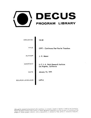 This document provides a technical write-up for a Continuous Fast Fourier Transform (CFFT) program designed for the PDP-12 computer. Developed by J. R. Mason at the UCLA Brain Research Institute, the program is a modification of a previous Cooley-Tukey algorithm (DECUS L-25) to allow for continuous sampling and spectral analysis of EEG data.