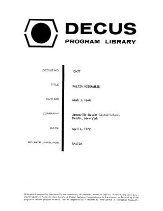 This document serves as the program library write-up for the PAL12A assembler, a 4K assembler optimized for the PDP-12 computer running under the DIAL-V2 monitor. It is based on MACRO-8 and provides several features previously unavailable in a Linctape-oriented assembler for small configurations, such as literals, off-page links, a core usage map, and specific new operators.