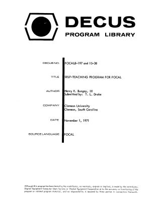 This document outlines a self-teaching program designed to help users learn the FOCAL programming language. Developed by H. R. Bungay, III at Clemson University in 1971, the program is intended to run on PDP-15 and PDP-8 computer systems.