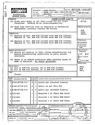 This Engineering Change Order details hardware modifications for the M7726 module (used in CL8, PDP8, and PDP11 systems) to address two specific technical issues: