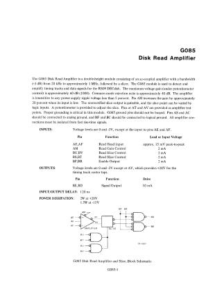Summary: The G085 Disk Read Amplifier is a double-height module designed to detect and amplify timing tracks and data signals for the RS09 DECdisk. It features an AC-coupled amplifier with a 20 kHz to 1 MHz bandwidth, a maximum voltage gain of approximately 60 dB, and a 40 dB common-mode rejection ratio. The module includes adjustable slice and gain settings, gateable slice output, and specific test points for signal monitoring. It operates with input/output voltage levels of 0V and -3V (with the exception of the +20V timing track center tap) and has a propagation delay of 120 ns.