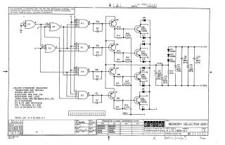 This document is a technical schematic for a Digital Equipment Corporation "Memory Selector" circuit (G221). The circuit utilizes several integrated circuits (DEC7400N and DEC7440N) to drive a series of transistor-based output stages (utilizing DEC2904 and DEC1008 transistors). The design includes various resistors, capacitors, and diodes (D672) to manage signal logic and power regulation, specifically designed to operate with a +5V logic supply and a -30V power rail. The document identifies the circuit components and their configurations, including pinouts for the integrated circuits and a transistor/diode conversion chart for maintenance and testing purposes.