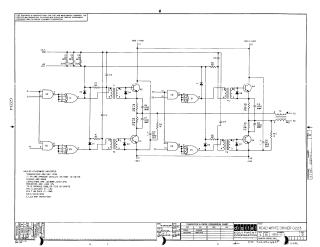 - Schematic Diagram: Details the electrical circuitry of the driver, including the integration of SN74H00 integrated circuits (E1, E2, E3), transistors (Q1-Q4), transformers (T1-T5), and various capacitors, diodes, and resistors. It specifies power requirements (-24V and +5V) and identifies specific component models, such as the D664 diodes and the specific Sprague part numbers for the transformers.