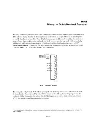 This document details the specifications and functional characteristics of the M161 decoder module. The M161 is designed to function as a binary-to-octal or binary-coded decimal (8421 or 2421)-to-decimal decoder.