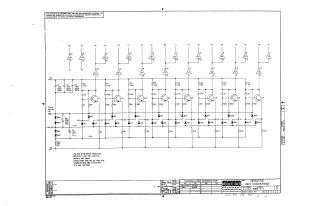 This document is a technical schematic for a Negative Bus Converter circuit designed by the Digital Equipment Corporation in 1970. The diagram details the electronic configuration, including the arrangement of eight identical channels consisting of integrated circuits (DEC7404), transistors (DEC3009B), diodes (D664), and various resistors and capacitors. It provides the wiring logic for input/output signals across an array of pins (BI through VI) and specifies voltage requirements, including +5V, -1.5V, -3V, and -15V supply rails.
