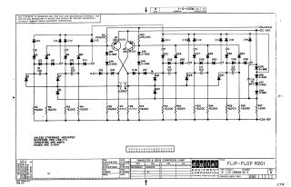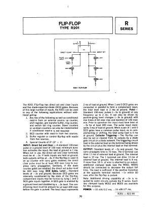 Summary: This document is a technical schematic for the "Flip-Flop R201" circuit, designed by Digital Equipment Corporation in 1964. The schematic illustrates a complex transistor-diode logic configuration involving two DEC 3639C transistors (Q1 and Q2) and a large array of diodes (D1 through D49) and capacitors. The circuit is designed to operate on a voltage supply of +10V and -15V. It includes specific component values, such as 1/4W resistors, and references a conversion chart for the transistors used in the design.