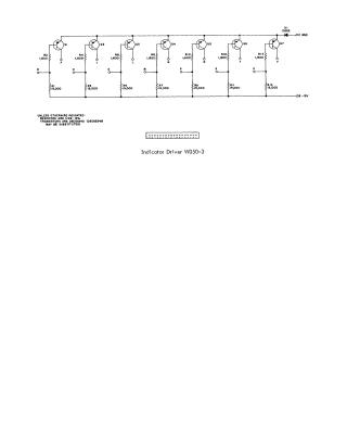 Summary: The W050 is a W-Series module containing seven transistor amplifiers designed to drive miniature incandescent indicator bulbs. It is primarily used to provide remote indication for R- or B-Series flip-flops. The module accepts standard logic inputs (-3v or ground) and can drive external loads between -2v and -20v, with a capacity of 30mA per channel at -2v. It requires +10v and -15v power supplies, and users should account for an additional 210mA current draw from the indicator supply when all lights are active.