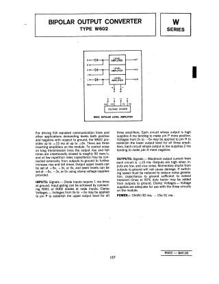 This document is a technical schematic for the Bipolar Level Amplifier W602, designed by the Digital Equipment Corporation in 1965. It provides a detailed circuit diagram illustrating the configuration of transistors (DEC6534D and DEC30098), diodes (D664 and D662), and various resistors used in the module. The document also includes a complete parts list, cross-referencing reference designations with component descriptions and specific DEC part numbers, intended for maintenance and testing purposes.