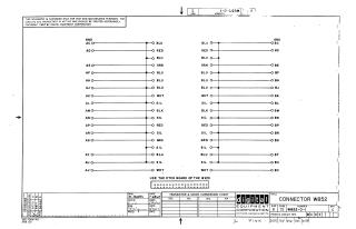 This document is a technical schematic for the Digital Equipment Corporation Connector W852. It illustrates the pin-to-pin wiring connections (labeled AC through AV) for the connector, mapping input signals to corresponding output pins (labeled BC through BV) based on various color-coded wires (e.g., Blue, Red, Green, White, Silver, Black). The document specifies that it is to be used with the W851 etch board and contains a note that the schematic is intended for test and maintenance purposes only.