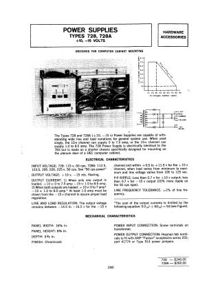 This document provides technical specifications for the Types 728 and 728A power supplies, which are designed for mounting in DEC computer cabinets. Key details include:
