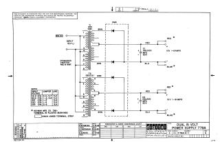Summary: This document is a technical schematic for a Digital Equipment Corporation Dual 15 Volt Power Supply (Model 778A). It outlines the electrical configuration of two transformers (T1 and T2) feeding into a diode rectifier network (DM9) to produce two 15V, 8-amp outputs. The schematic includes a table detailing jumper configurations required to accommodate various input voltages (ranging from 112.5V to 235V). Additional details include component specifications (such as 160,000 MFD, 20V capacitors) and assembly notes regarding terminal types.