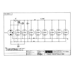 This document is a technical schematic for the Digital Equipment Corporation Power Receptacle 828. It depicts an electrical circuit designed for a 117V AC input that connects to a series of eight female output sockets.