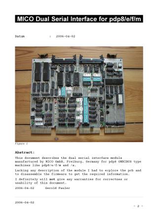 This document provides a technical overview and firmware analysis of the MICO Dual Serial Interface module designed for PDP-8 OMNIBUS computer systems (such as the PDP-8/e, f, m, and a). Because no official manufacturer documentation was available, the author reverse-engineered the module by analyzing the PCB layout and disassembling the onboard firmware.