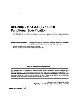 This document is the Functional Specification for the DECchip 21164-AA (EV5 CPU), a high-performance, single-chip microprocessor developed by Digital Equipment Corporation, implementing the Alpha architecture.
