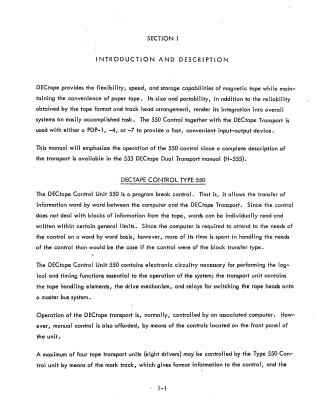 This manual provides a detailed technical and operational description of the DECtape Control Unit Type 550, which is designed to serve as a fast, reliable input-output device for PDP-1, PDP-4, and PDP-7 computers.