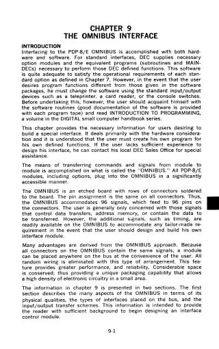 This document serves as an introduction to the OMNIBUS interface system used in the PDP-8/E computer. It explains that the OMNIBUS is a hardware interconnect system consisting of an etched backplane board with standardized connector slots, which allows modules to be plugged into any position, eliminating complex point-to-point wiring.