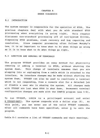 TTYSET program, which allows system managers to add, remove, enable, disable, or reset terminals without shutting down the system. It provides a detailed command reference for these functions and lists common error messages encountered when using the utility.CONFIG program to update memory settings.The chapter emphasizes that while standard operations are automated, the system manager must be prepared to handle exceptions, perform emergency configurations, and interpret diagnostic messages to maintain system availability.