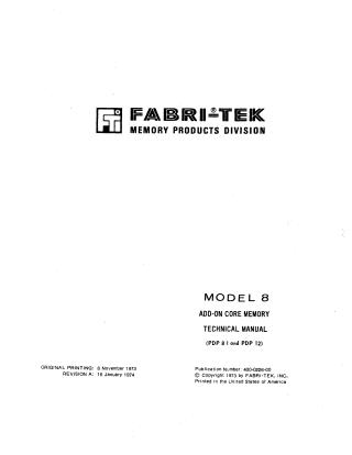 This document is a technical manual for the Fabri-Tek Model 8/I Add-On Memory System, designed for use with Digital Equipment Corporation PDP-8/I and PDP-12 computers. The system provides an additional 24K (24,576) words of memory using a three-wire, 3D, coincident-current core memory architecture.