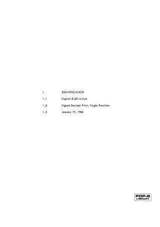 This document provides technical documentation for a subroutine designed for the PDP-8 computer. The subroutine's primary function is to output the contents of a computer word as a signed, four-digit decimal integer. It interprets binary numbers stored in two's complement format: if the number is negative, it prints a minus sign; if positive, it prints a space.
