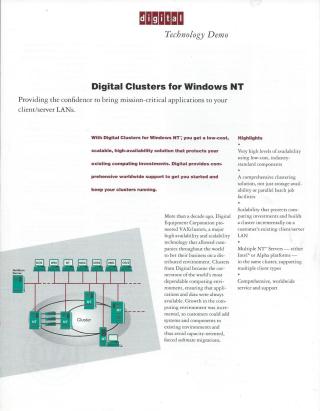 This document introduces Digital Clusters for Windows NT, a solution designed to provide high availability and scalability for mission-critical applications on client/server LANs.